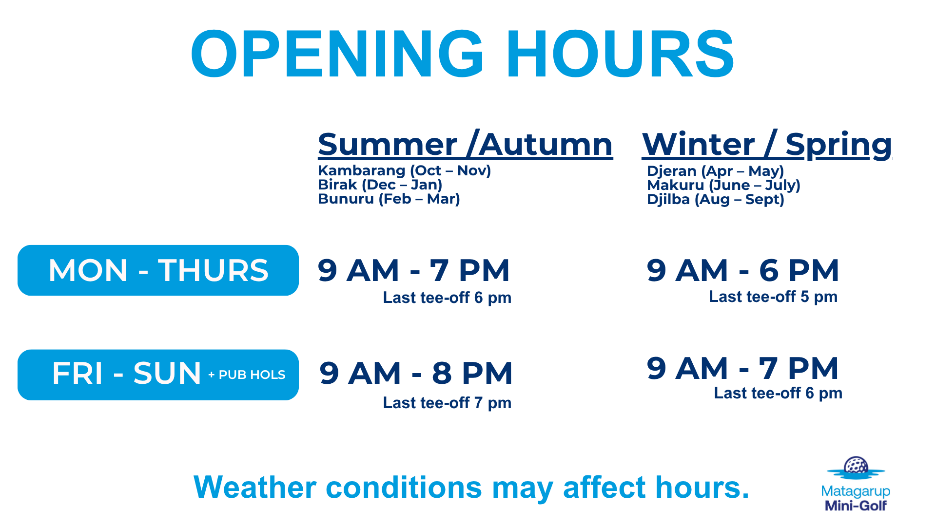 Opening hours will vary from season to season. Refer to Google Open Hours for up to date operational hours.